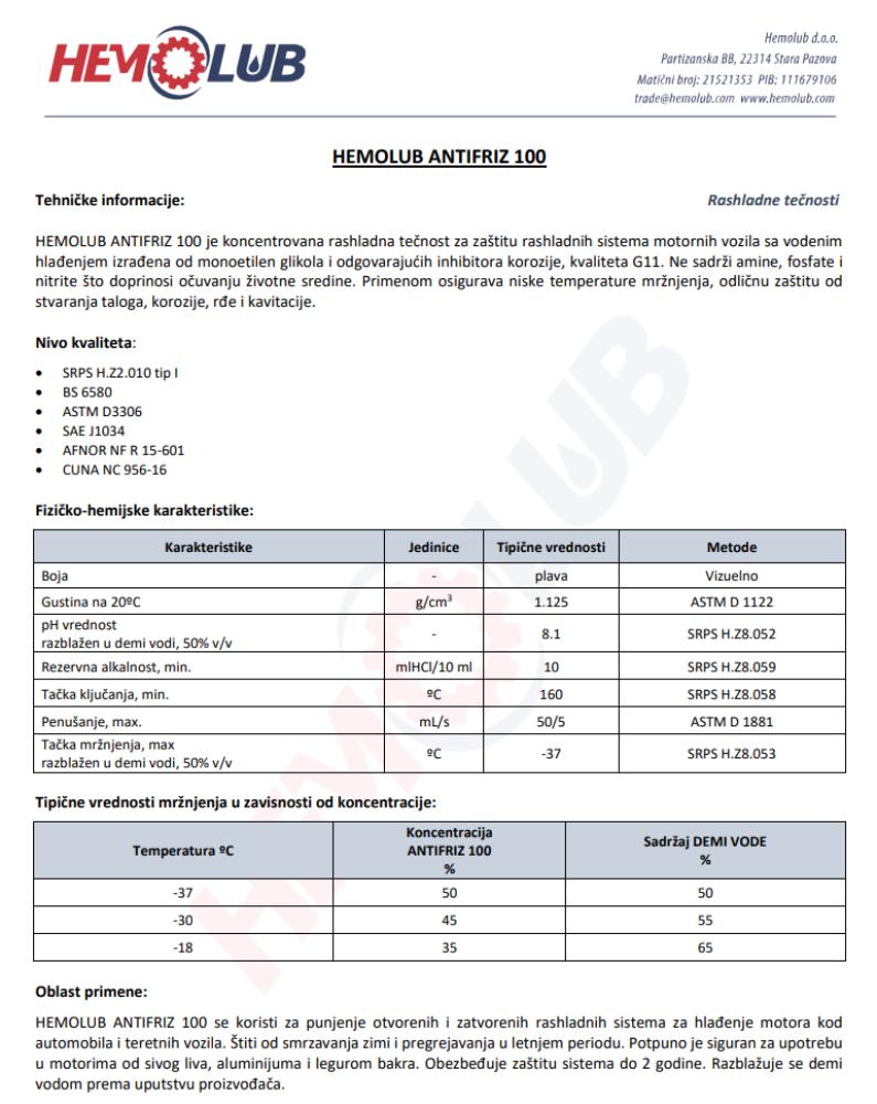 | Opis | Koncentrovana rashladna tečnost za zaštitu motora sa vodenim hlađenjem, izrađena od monoetilen glikola i odgovarajućih inhibitora korozije, kvaliteta G11. Ne sadrži amine, fosfate, nitrite, borate i silikate. Primenom osigurava niske temperature mržnjenja, odličnu zaštitu čeličnih i aluminijumskih delova motora od korozije, rđe, kavitacije i stvaranja taloga. Štiti od smrzavanja zimi i pregrejavanja u letnjem periodu. Obezbeđuje zaštitu sistema do 2 godine. Razblažuje se demi vodom prema uputstvu proizvođača. SPECIFIKACIJA SRPS H.Z2.010 tip I; BS 6580; ASTM D3306; SAE J1034; AFNOR NF R 15-601; CUNA NC 956-16 |