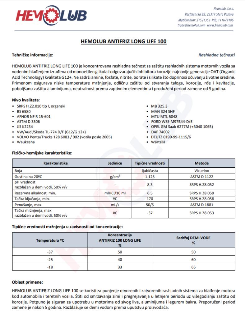| Specifikacija | SRPS H.Z2.010 tip I, organski; BS 6580; MB 325.3; AFNOR NF R 15-601; MAN 324 SNF; ASTM D 3306; JIS K2234; FORD WSS-M97B44-D/E; OPEL GM Saab 6277M (+B040 1065); MTU MTL 5048; VW/Audi/Škoda TL-774 D/F (G12/G12+); VOLVO Penta/Trucks 128 6083 / 002 (vozila posle 2005); DAF 74002; DEUTZ 0199-99-1115/6; Waukesha; Wärtsilä |