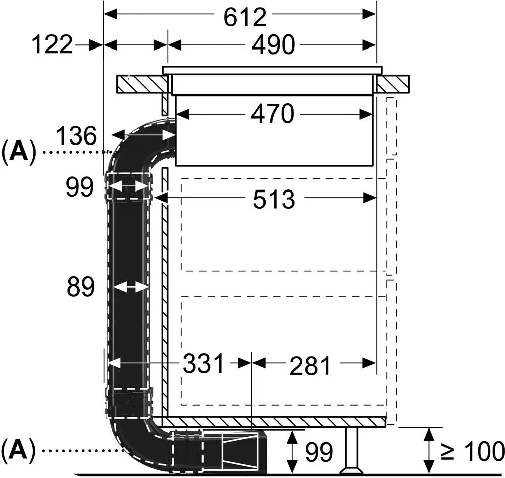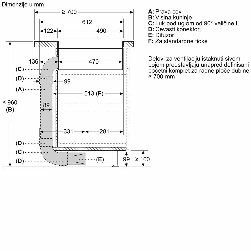 Komplet dodatnog pribora za konfiguracije za recirkulaciju delimično putem cevi vaše ploče za kuvanje sa ugrađenim modulom za ventilaciju u kuhinjama u kojima je dubina radne ploče 70 cm ili više.