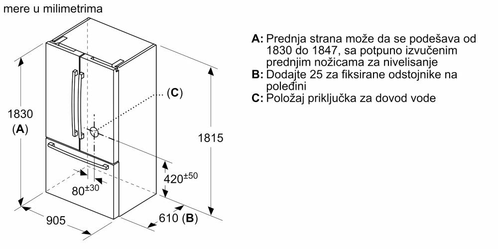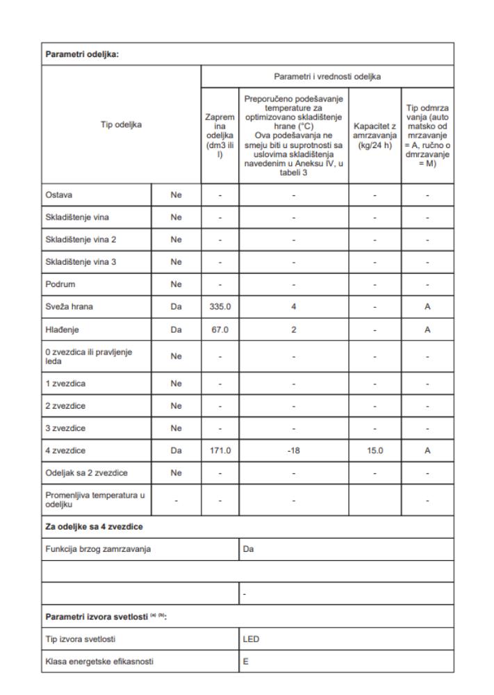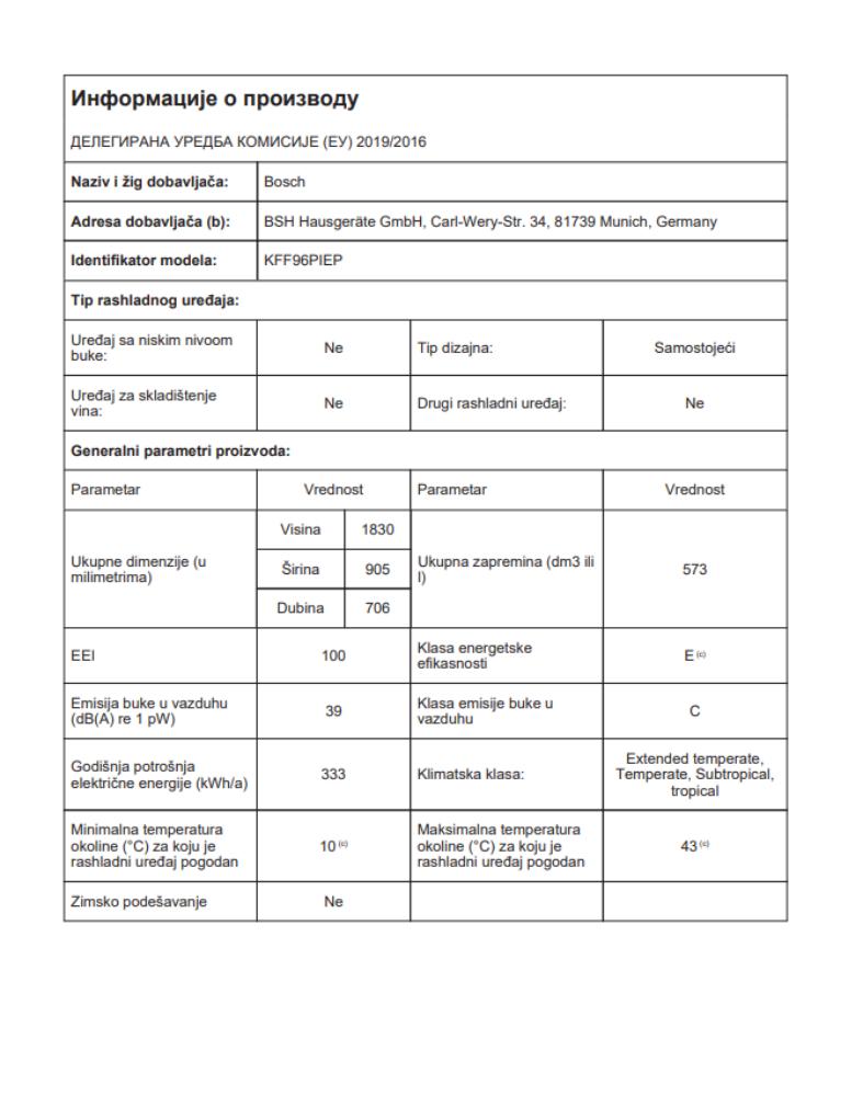 | Dodatne funkcije | Multi Airflow-System Filter AirFresh - neutralizuje neželjene mirise i obezbeđuje svež vazduh u unutrašnjosti aparata Smart kontrola preko mobilnog telefona ili tableta Režim rada tokom odmora Super hlađenje Automatsko otapanje frižidera Optički i akustički sistem upozoravanja kod otvorenih vrata Optički i akustički sistem upozoravanja kod povećanja temperature |