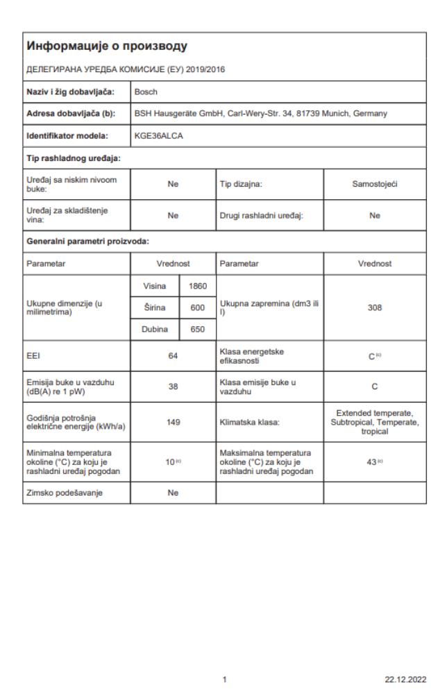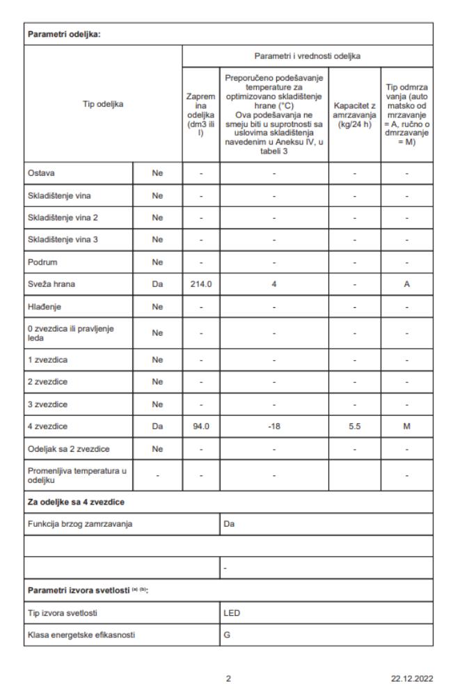 | Potrošnja el. Energije | 161 kWh / godišnje |