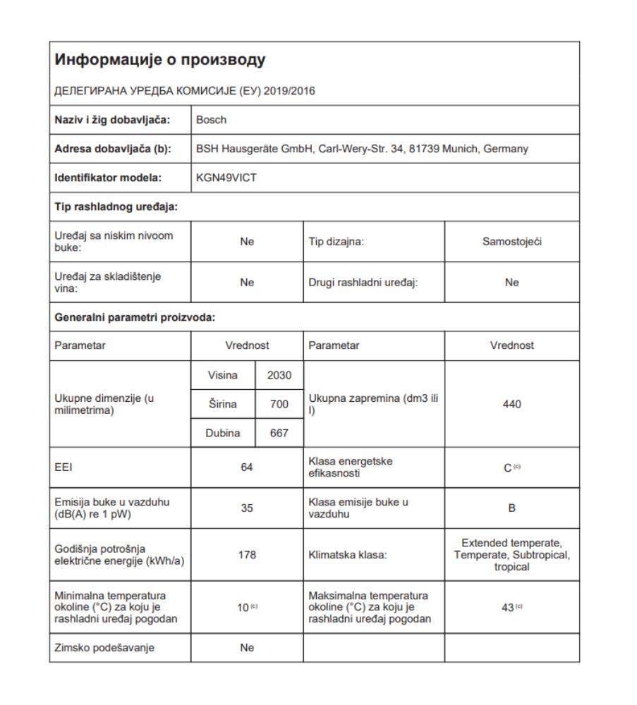| Tip | Samostojeći frižider sa zamrzivačem |