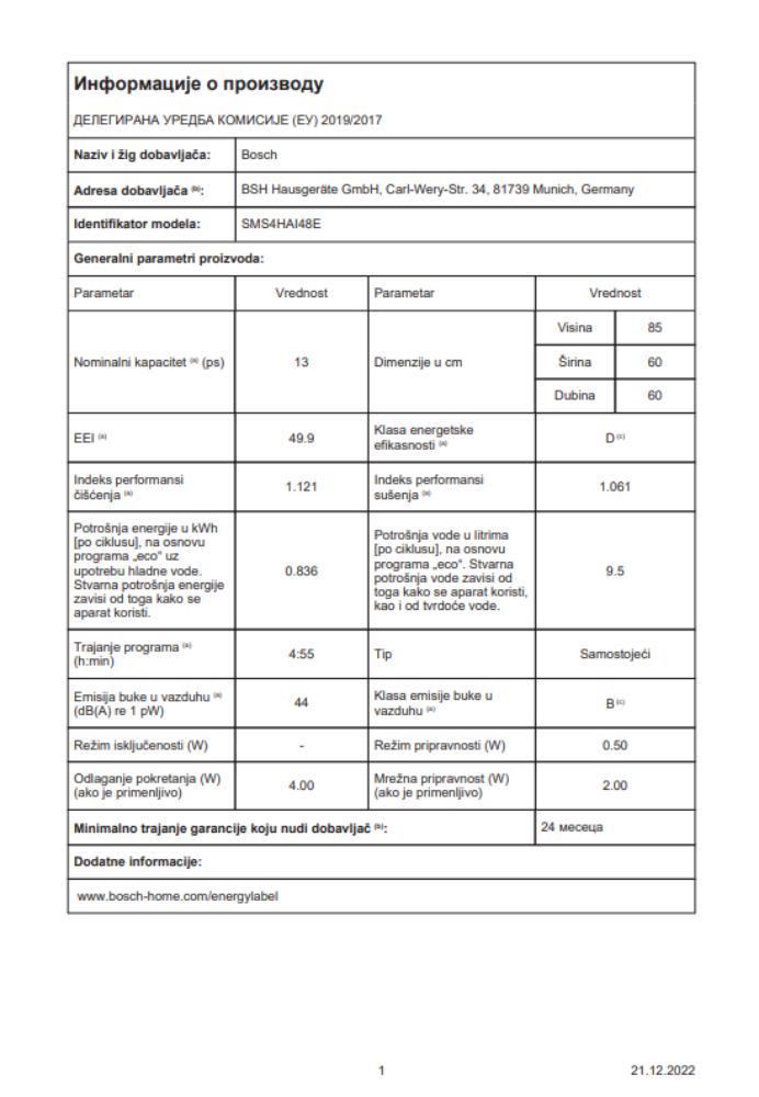 | Funkcije i karakteristike | Wi-Fi konekcija 4 posebne funkcije: Home Connect Extra Dry Half Load - pola opterećenja Brzina na zahtev - VarioSpeed Plus Funkcija Dosage Assist obezbeđuje optimalne rezultate čišćenja zahvaljujući potpunom otapanju tablete i tiše pranje Tehnologija za zaštitu stakla |
