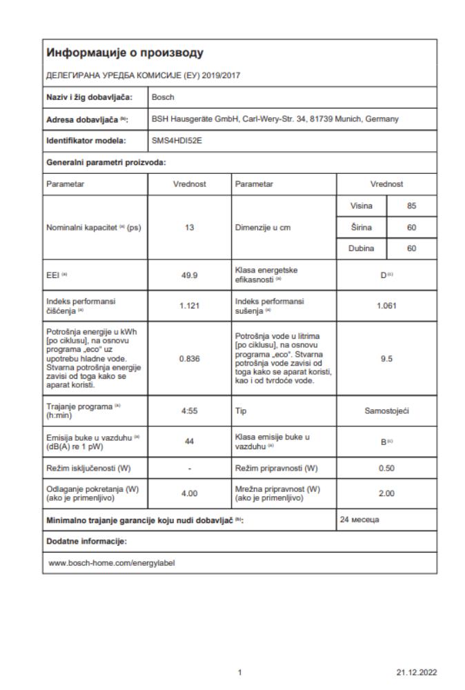 | Funkcije i karakteristike | - ExtraDry: opcija izuzetno temeljnog sušenja za sudove koji se naročito teško suše. - Silence Plus: izuzetno tih rad na 44 dB. - Extra Clean Zone - zona za dodatno čišćenje: dodatno temeljno pranje jako zaprljanih sudova u gornjoj korpi. - Funkcija „Omiljeni program“: personalizovani program pranja - jednostavnim dodirom dugmeta. - Displej od 7 delova: prikazuje preostalo vreme i standardne informacije, kao što je status ponovnog punjenja. - Toplotni menjač - AquaSensor, Senzor punjenja - Dozirni asistent - EcoSilence Drive inverter motor - Automatsko prepoznavanje sredstva za čišćenje - Filtrirni sistem samočišćenja sa troslojnim talasastim sistemom filtriranja - Unutrašnjost od nerđajućeg čelika |