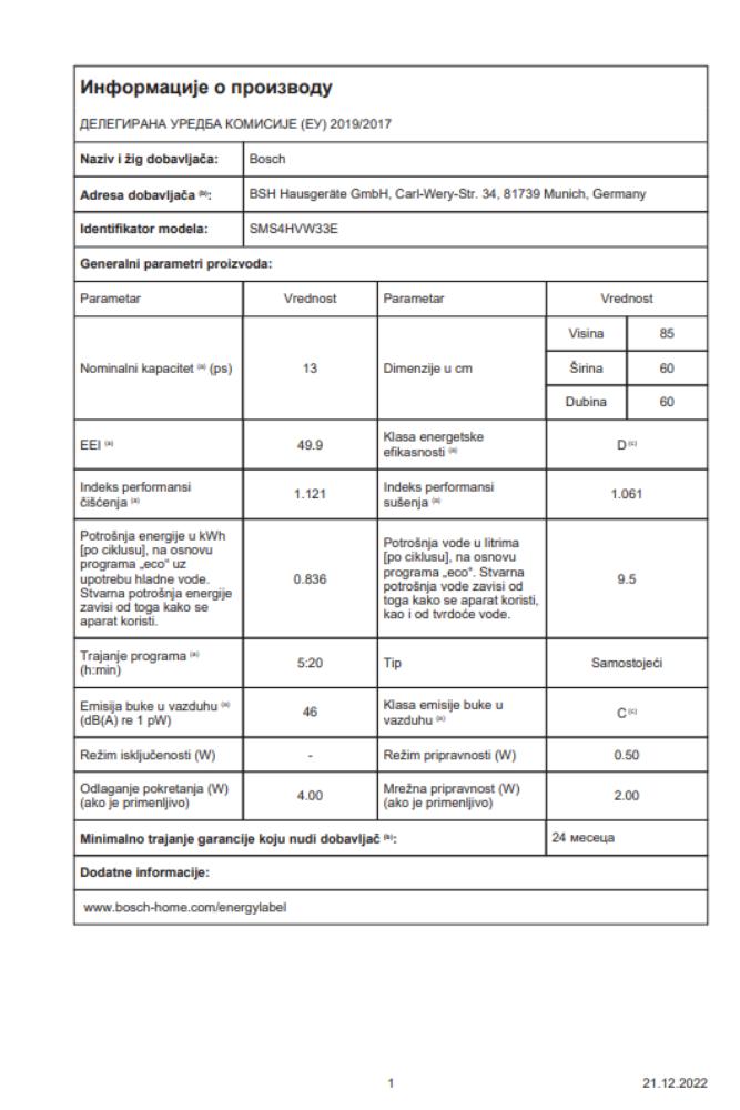 | Funkcije i karakteristike | - AquaSensor, Senzor punjenja - Dozirni asistent - EcoSilence Drive inverter motor - Automatsko prepoznavanje sredstva za čišćenje - Filtrirni sistem samočišćenja sa troslojnim talasastim sistemom filtriranja - AquaStop: Bosch garancija za oštećenja nastala izlivanjem vode – tokom celog radnog veka uređaja - Zaključavanje podešavanja pred decom |