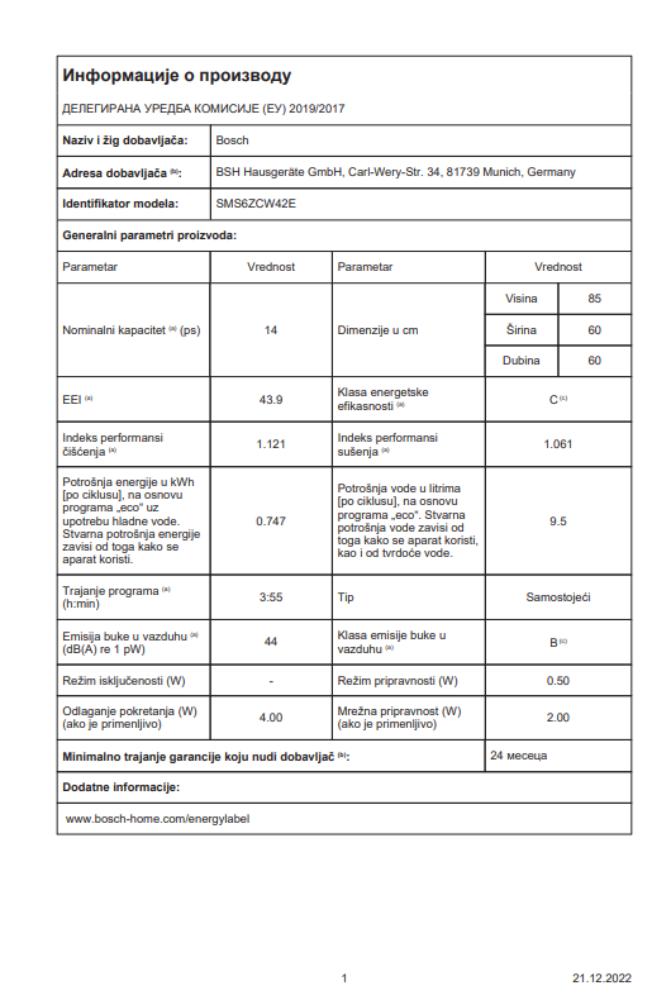 | Ugradne dimenzije | 60 cm x 84,5 cm x 60 cm |