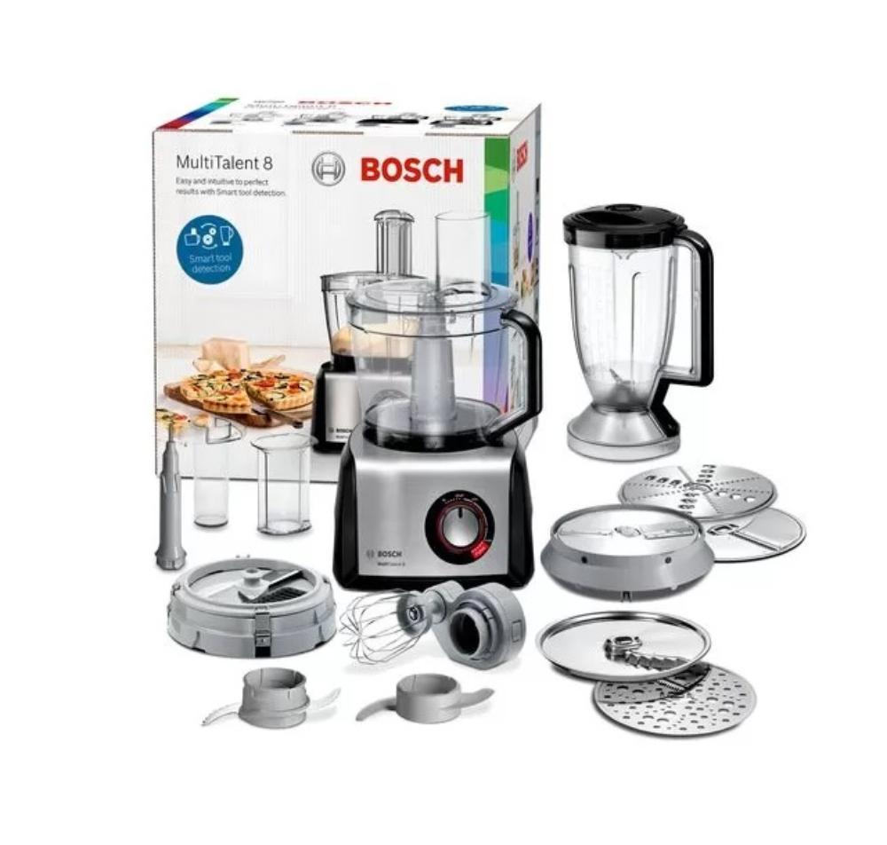 | Dodaci | Cube Cutter za rezanje voća, povrća, mekog sira i mesa na jednakomerne kocke (0,8 cm) Bokal za mešanje, plastičan 1,5 l Ploča za rezanje (tanko i debelo), ploča za struganje (grubo i fino) Ploče za grubo ribanje, nerđajući čelik Ploča za azijsko povrće (Julienne ploča) Ploča za pomrit Ploče od nerđajućeg čelika Nosač ploča Plastični nastavak za gnječenje Mutilica (od nerđajućeg čelika) za šlag, belenca i testa |