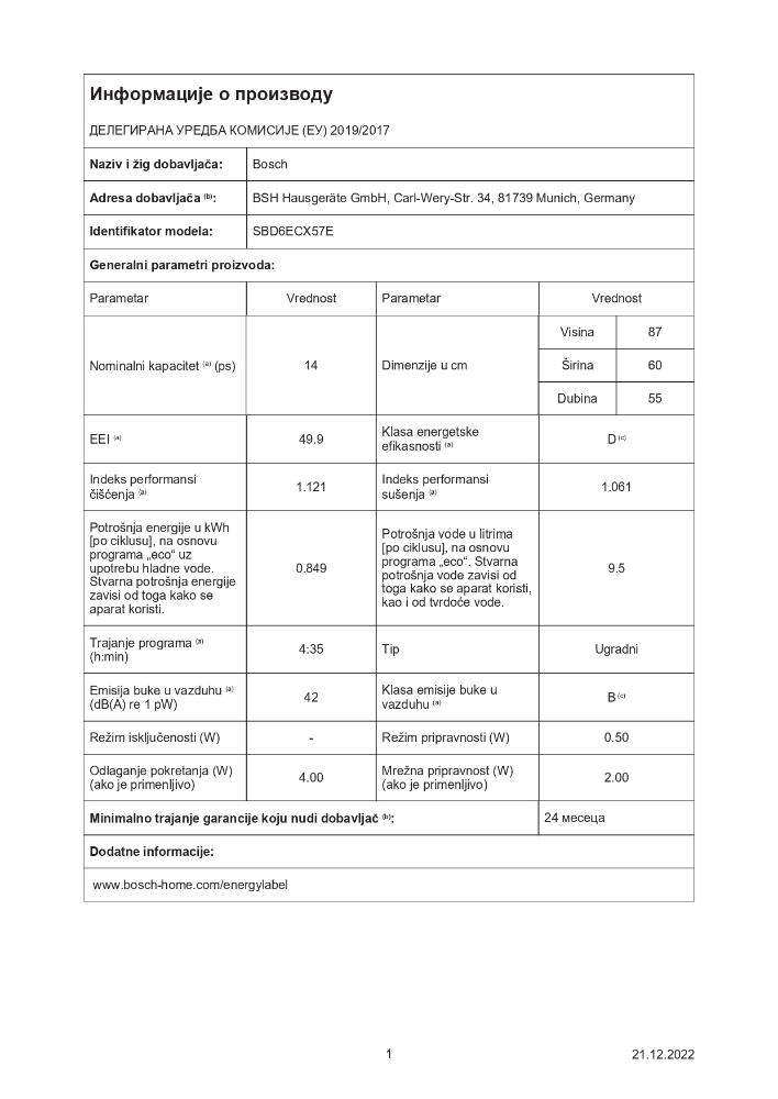| Karakteristike | Posebne funkcije: Home Connect, Efficient Dry, Intensive Zone, HygienePlus, Speed on demand - VarioSpeed Plus, Machine Care, Silence on demand - putem aplikacije Home Connect Senzor punjenja EcoSilence Drive inverter motor Automatsko prepoznavanje sredstva za čišćenje Filtrirni sistem samočišćenja sa troslojnim talasastim sistemom filtriranja PiezoTouchControl Upravljanje sa vrha TimeLight OpenAssist Sistem zaštite čaša |