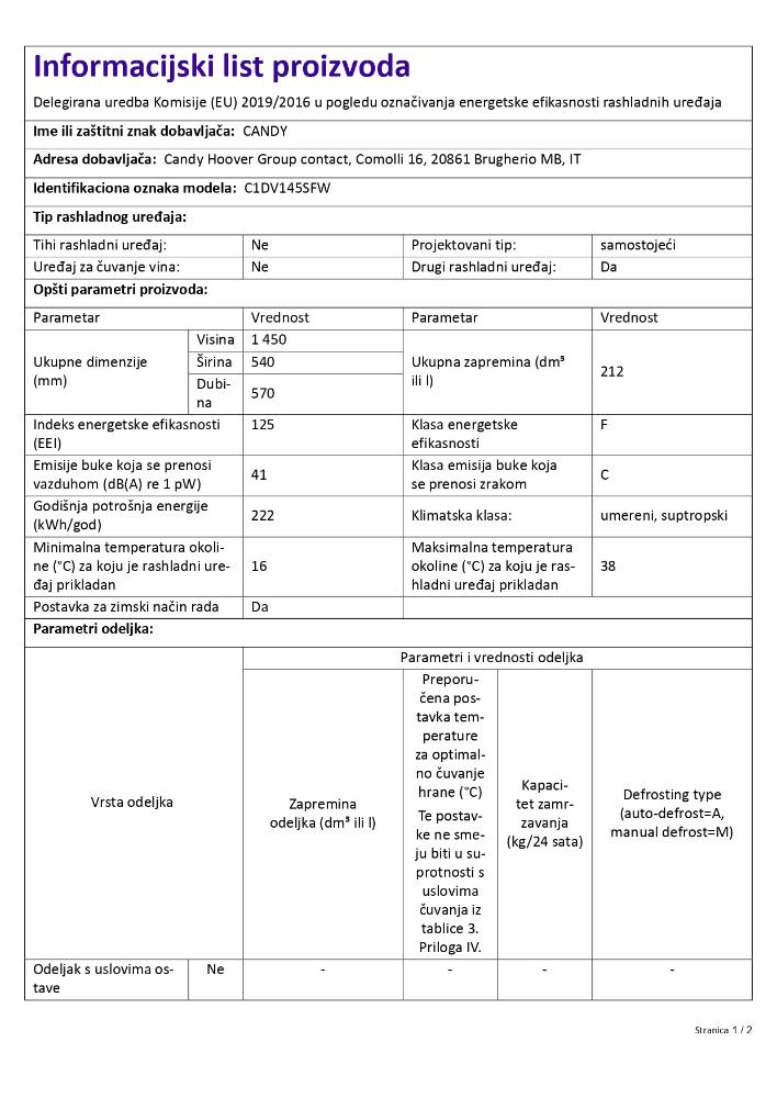 | Frižider | 3 x staklene police 3 x police na vratima Fioka za voće i povrće |