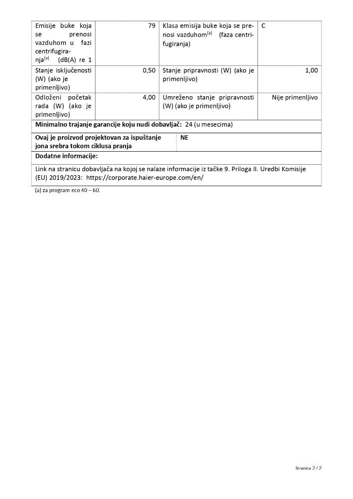 | Standardni programi: | Pamuk - beli veš do 90°C - Pamuk sa pretpranjem - Eco program na 20°C - Standardni programi za sintetiku, teksas i osetljivo - Delikatni program za vunu i svilu - Auto-Clean program za samočišćenje bubnja Displej: Touch kontrola Odložen start: do 24 h Indikator preostalog vremena Smart KG detector: automatska regulacija potrošnje vode, struje i vremena prema stavljenoj količini veša, od 1 kg do punog kapaciteta Taster za regulaciju brzine centrifuge Taster za regulaciju temperature "Time control" taster za skraćenje vremena pranja, čak i na programu 90°C Dodatne opcije: Hygiene, dodatno ispiranje, lakše peglanje Zaštita od izlivanja pene Senzor stabilnosti tokom centrifuge Smart touch - mogućnost autodijagnostike mašine putem NFC mreže Simply-Fi NFC |