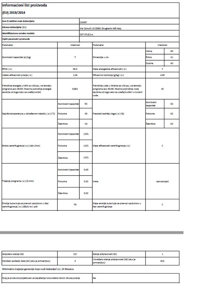 | Programi za pranje | 3 brza programa: Mix 59 minuta - brzo pranje 40°C, pun kapacitet Perfect Pamuk 59 minuta - za zaprljan obojen pamučni veš Eco 30 minuta - štedljiv program za slabije zaprljanu odeću Standardni programi: Pamuk - Beli veš - do 90°C Pamuk sa pretpranjem Eco program na 20°C Standardni programi za sintetiku, teksas i osetljivo Delikatni program za vunu i svilu Auto-Clean program za samočišćenje bubnja |