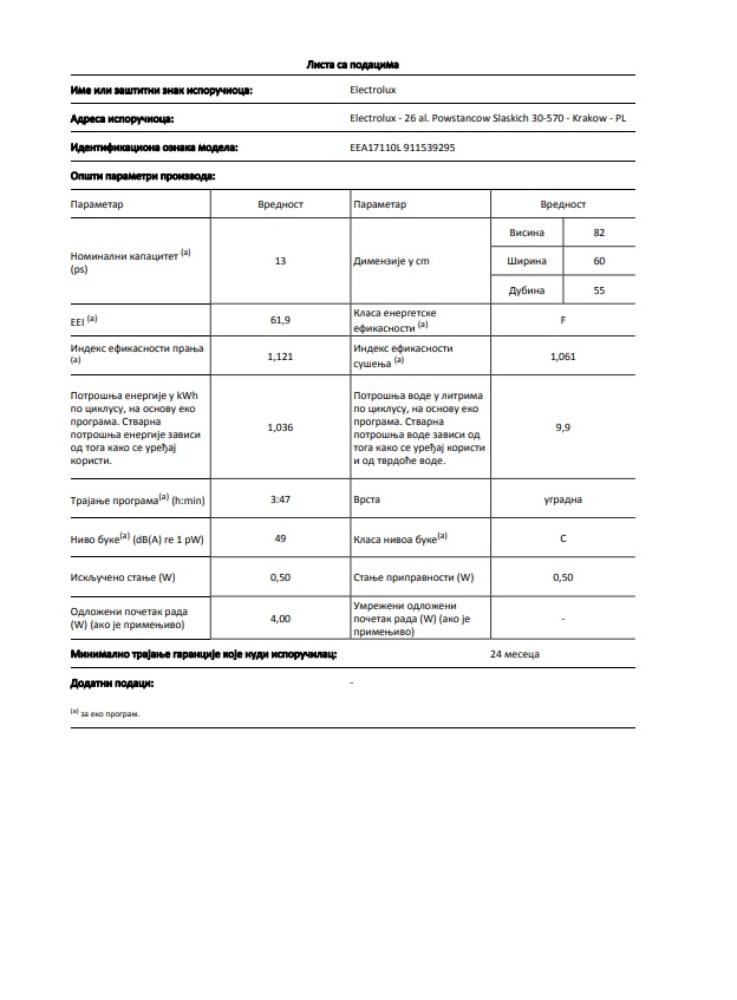 | Ugradne dimenzije | Širina: 60.00 cm Visina: 82.00 cm Dubina: 55.00 cm |