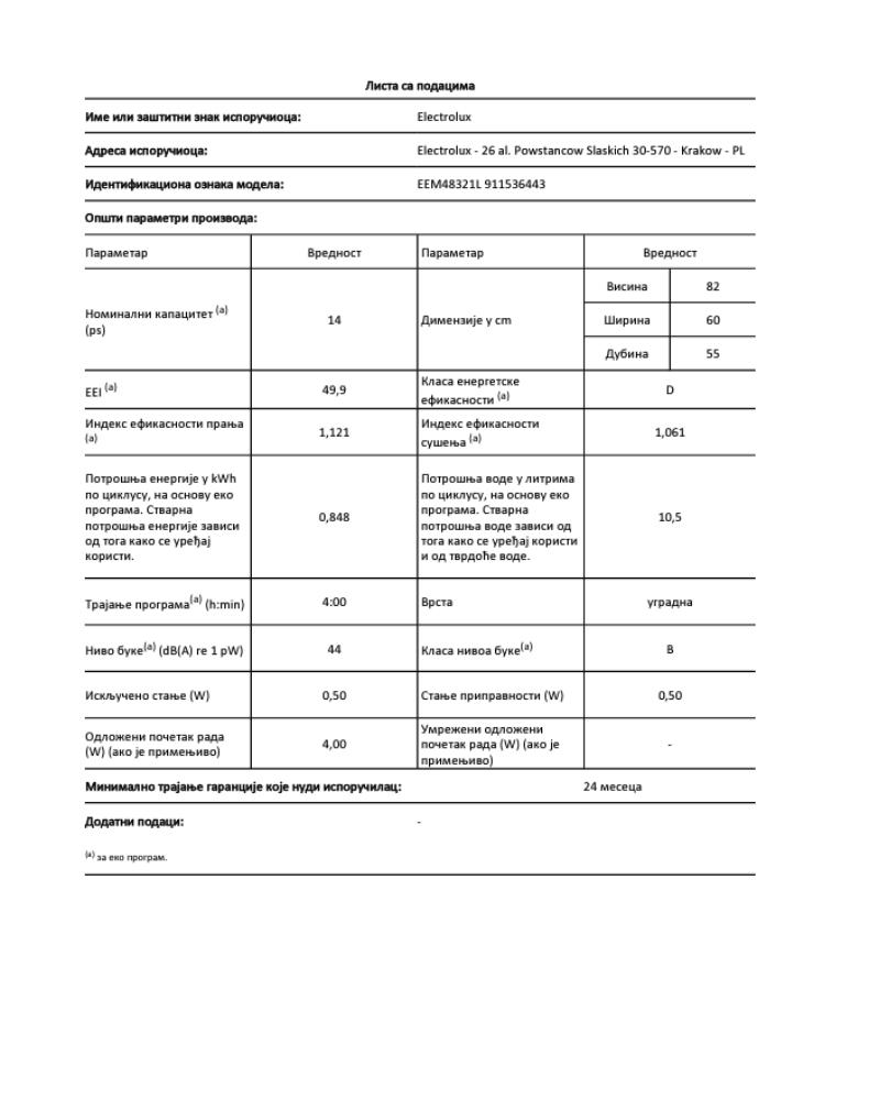 | Potrošnja el. Energije | Potrošnja električne energije godišnje: 237kW/h Potrošnja vode: 2,940 L/godišnje |