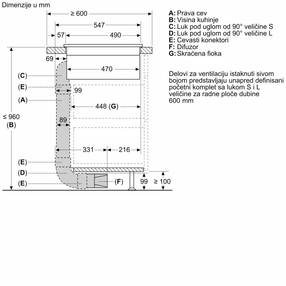 Komplet dodatnog pribora za konfiguracije za recirkulaciju delimično putem cevi vaše ploče za kuvanje sa ugrađenim modulom za ventilaciju u kuhinjama u kojima je dubina radne ploče 60 cm ili više.