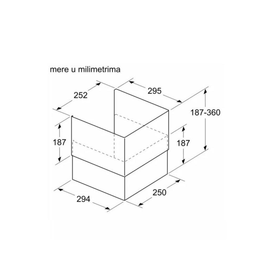 | Dodatni pribor | Produžetak dimnjaka 187-360 mm za integrisani aspirator. Dvodelni set dimnjaka za pojedinačno podešavanje visine u ormaru. Pogodno za kanalnu i recirkulacijsku ekstrakciju |