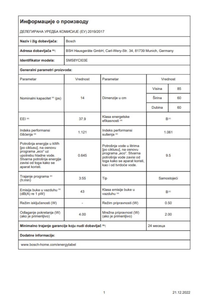 | Sigurnost | AquaStop: Bosch garancija za oštećenja nastala izlivanjem vode – tokom celog radnog veka uređaja.* Tehnologija za zaštitu stakla uključujući levak za sipanje soli |