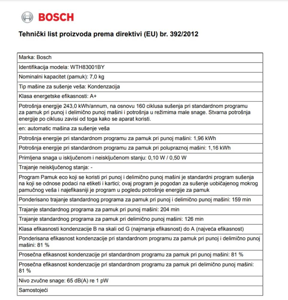 | Posebni programi | Vuna, Mešano, Peškiri, Vremenski program 30 min - hladno, Vremenski program 30 min - toplo, Sportswear, Sušenje perja, Super 40, Bluze/košulje |