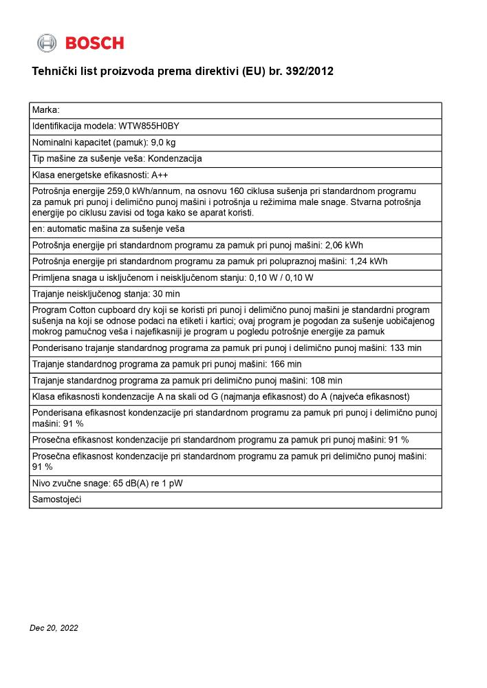 | Godišnja potrošnja energije | Godišnja potrošnja energije259 kWh |