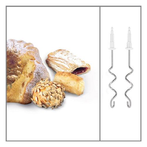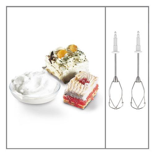 | Karakteristike | Ergonomsko oblikovano "soft-touch" kućište, 2 izuzetno efikasne Fine-Creamer metlice od nerđajućeg čelika: za jako kratko vreme odlični rezultati mućenja i mešanja, 2 metlice za gnječenje, Priključak za nogu za mešanje štapnog miksera |