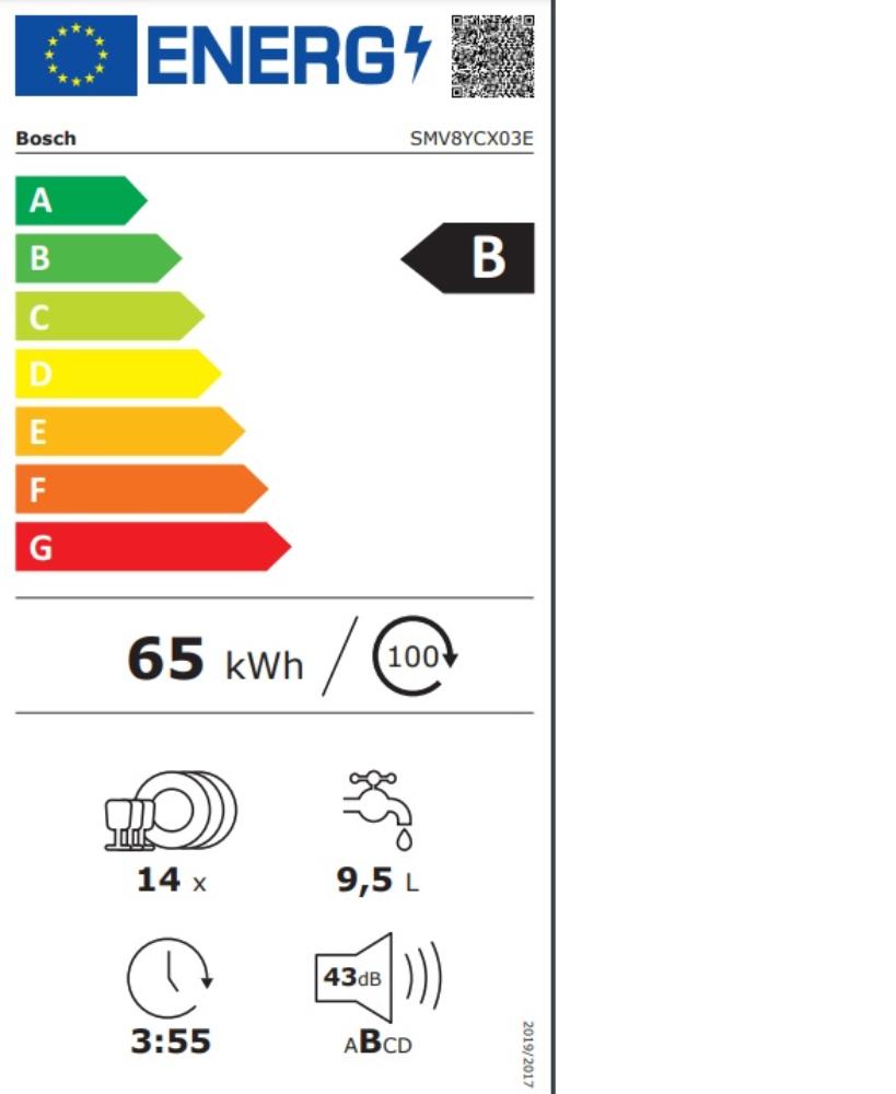 | Potrošnja energije po ciklusu | Na 100 ciklusa u programu Eco 50°C: 65 kW |