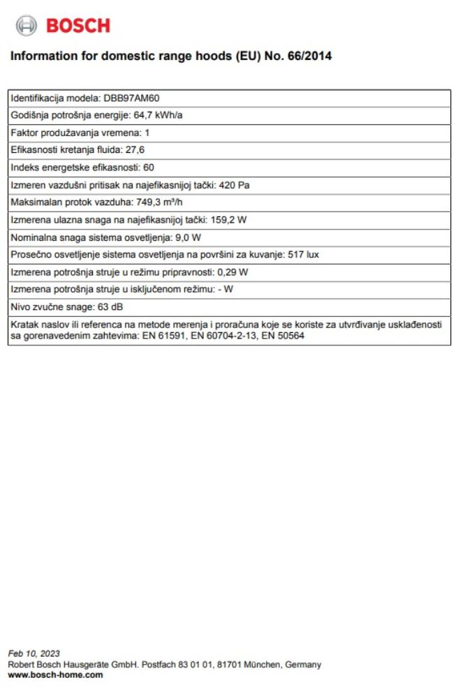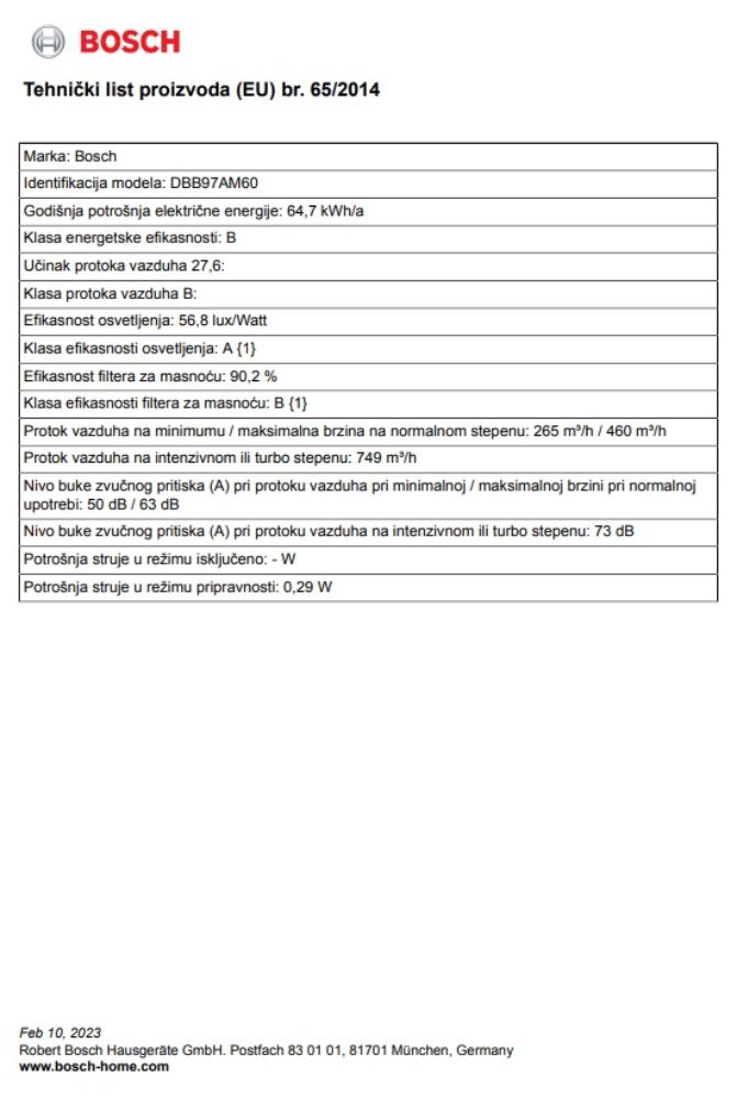 | Ostalo | Dve mogućnosti delovanja: odvođenje vazduha ili kruženje vazduha (potrebno dokupiti komplet za recirkulaciju). Montaža u ravni za besprekorno uklapanje u zidne kuhinjske elemente. Stakleni panel sa komandom osetljivom na dodir za lako rukovanje i pojačano zadržavanje pare. Elektronsko upravljanje, LED displej (svetleće diode). Automatsko isključivanje intenzivnog stepena. Ventilator i svetlo automatski se uključuju i isključuju otvaranjem i zatvaranjem staklenog panela. 2 x 2 W LED. SoftLight postepeno osvetljenje/zatamnjenje. |