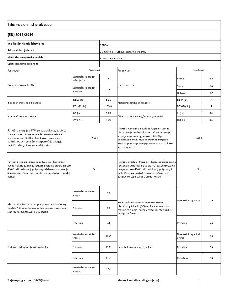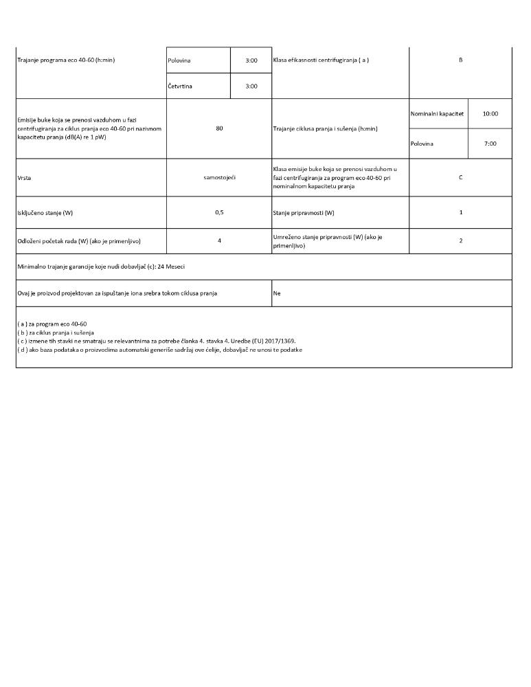 | Programi | Speed 39 minuta - savršeni rezultati pranja, do pola kapaciteta Perfect pamuk 59 minuta - brzo pranje za zaprljan obojen pamuk Delikatni 59 minuta - za osetljivi pamuk, sintetiku i mešane materijale ECO 14-30-44 minuta - 3 štedljiva programa, za manje zaprljan veš Standardni programi: Programi za pamuk i sintetiku Beli veš - pamuk do 90°C Delikatni program za vunu i svilu 3 programa sušenja za pamuk, sintetiku i vunu - senzorski ili vremenski program AutoClean program za automatsko čišćenje bubnja |