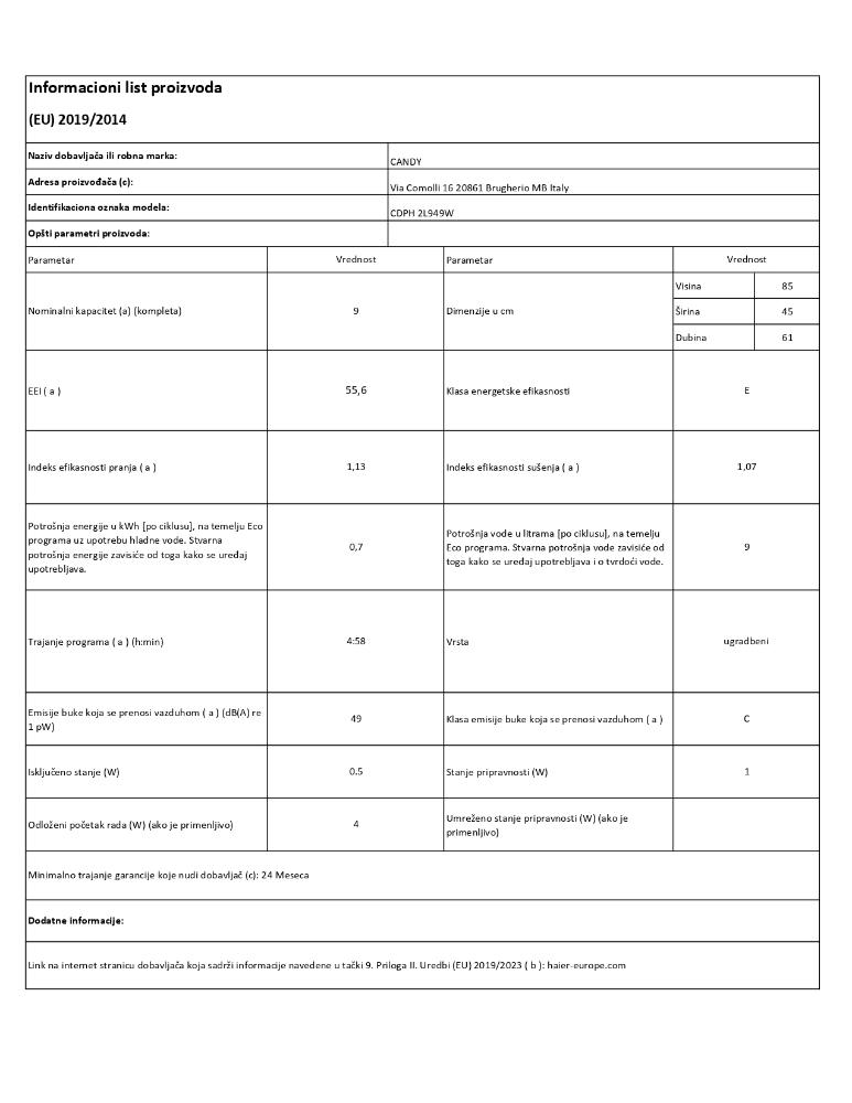 | Programi | 5 programa: Intenzivan 70°, za veoma zaprljano posuđe Univerzalan 60°, za normalno zaprljano posuđe Eco 50°, pranje A klase sa najoptimalnijom potrošnjom vode i struje Brzi program ZOOM 32 minuta, najbrži ciklus, na 45°C Dodatno ispiranje / osvežavanje, za sudove koji će biti prani kasnije ili dodatno ispiranje na 45°C |