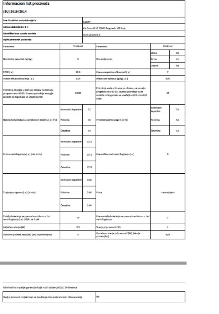 | Programi za pranje | 3 brza programa: Mix 59 minuta - brzo pranje 40°C, pun kapacitet Perfect Pamuk 59 minuta - za zaprljan obojen pamučni veš Eco 14 - 30 - 44 minuta - štedljivi programi za slabije zaprljanu odeću Standardni programi: Pamuk - Beli veš - do 90°C Pamuk sa pretpranjem Eco program na 20°C Standardni programi za sintetiku, teksas i osetljivo Delikatni program za vunu i svilu Auto-Clean program za samočišćenje bubnja |