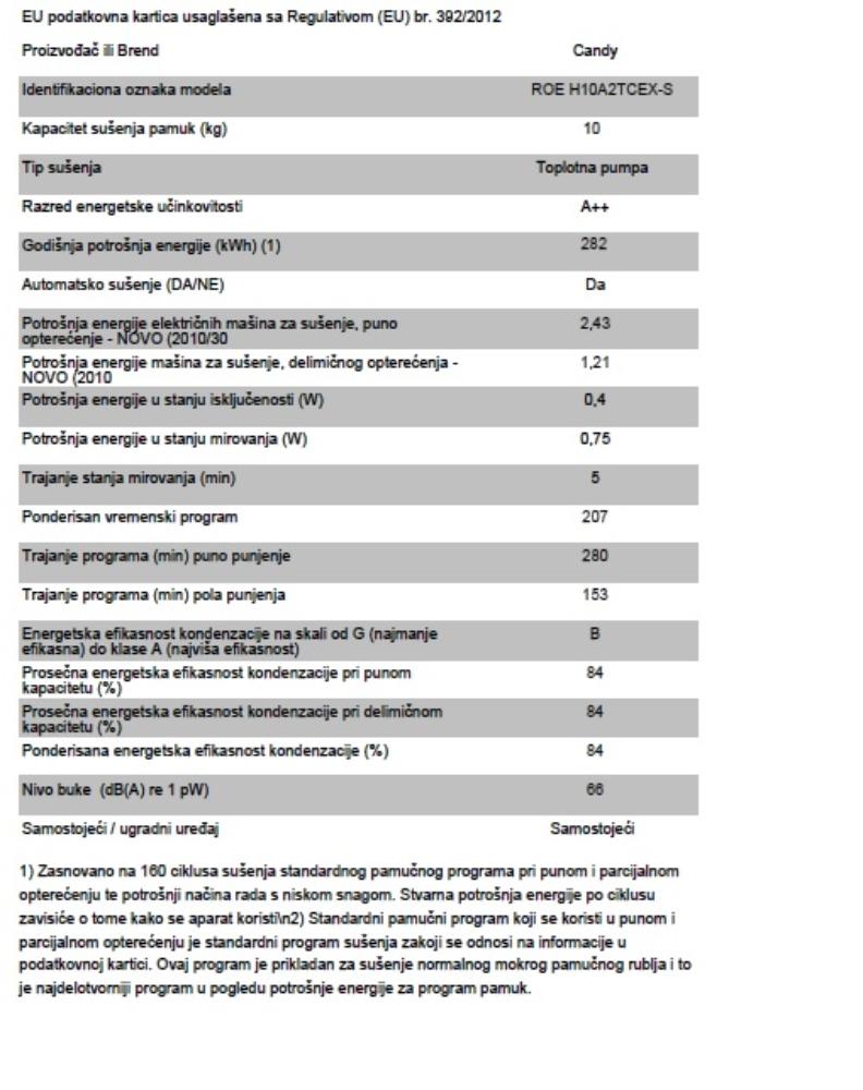 | Ostalo | Mogućnost preuzimanja preko 20 didatnih specijalizovanih programa sušenja Mogućnost direktne sinhronizacije sa Candy RAPIDO veš mašinom |