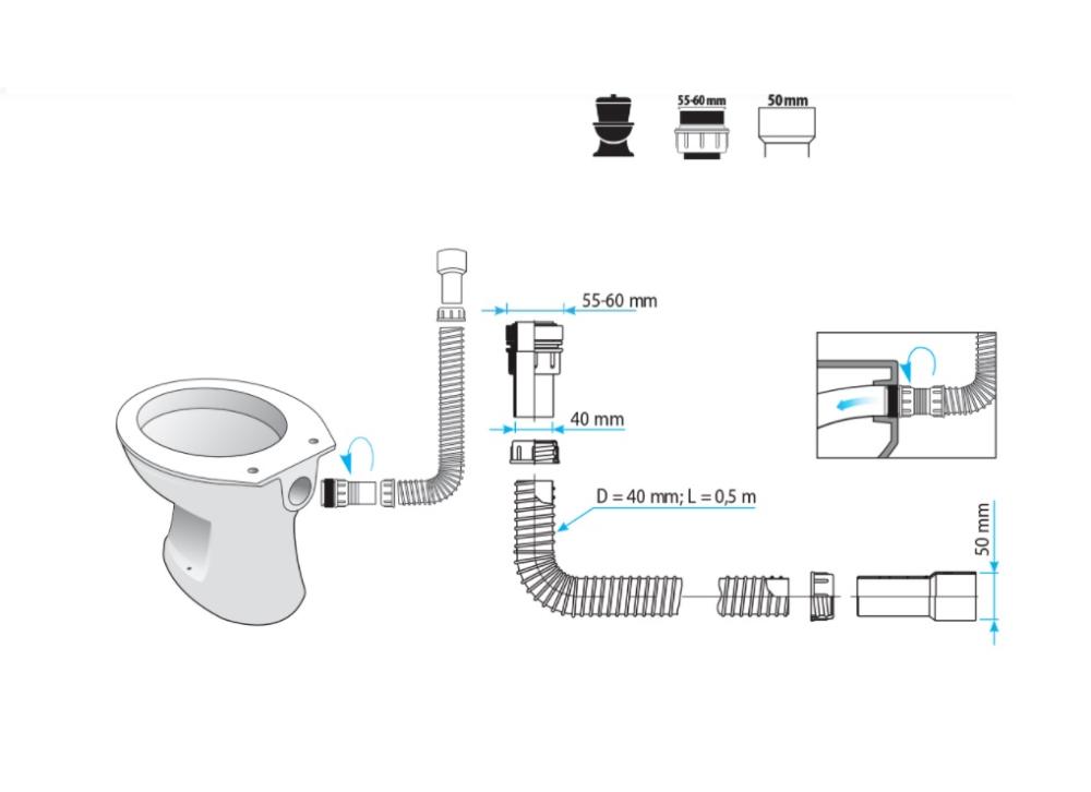 | Opis | Savitljiva PVC cev prečnika 40 mm, iznutra potpuno glatko, spolja spiralno motana. Priključak elastične veze sa zaptivkom za WC-šolju. |