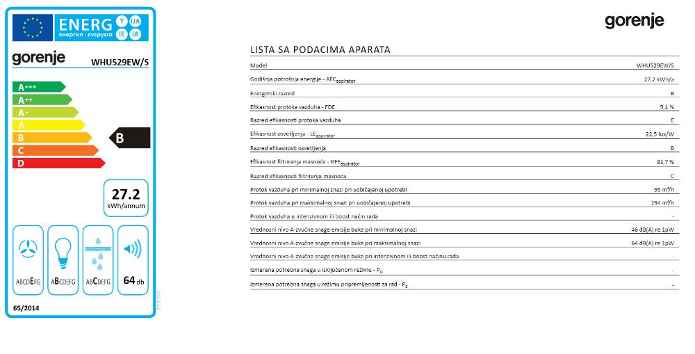 | Karakteristike | Energetski razred: B Materijal kućišta/dekorativnog dimnjaka: Aluminijum i staklo Razred efikasnosti osvetljenja: B Razred efikasnosti filtriranja masnoće: C Razred efikasnosti protoka vazduha: E Prečnik odvodne cevi: 12 cm Protok vazduha kod odvodnog načina rada, nivo 1: 95 m³/h Protok vazduha kod odvodnog načina rada, nivo 2: 156 m³/h Protok vazduha kod odvodnog načina rada, nivo 3: 194 m³/h Broj nivoa ventiliranja: 3 Filter za masnoću: Sintetički filter za masnoću Ugljeni filter kao dodatna oprema: 784407 Filter za masnoću koji se pere Broj motora: 1 Klapna za nepovratni protok vazduha: 125 mm |