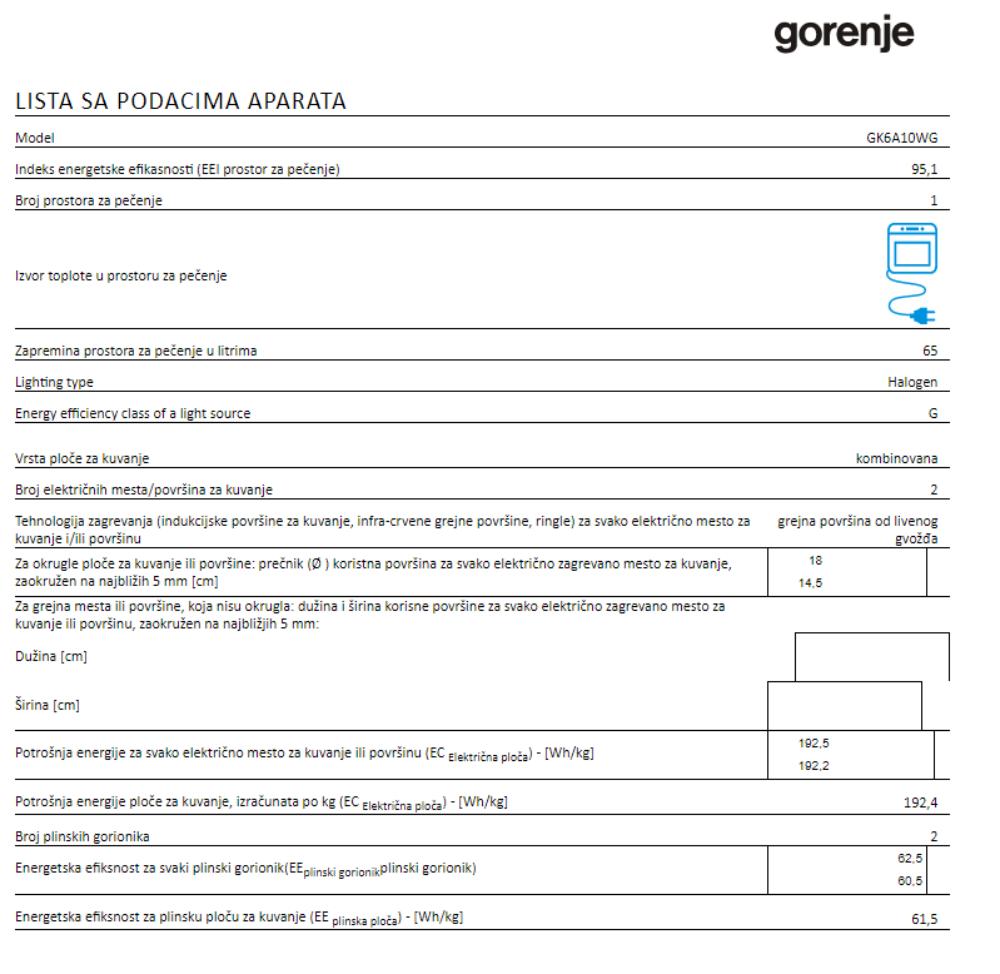 | Polja za kuvanje | 1 veliki plamenik+ 1 standardni plamenik+ 1 ekspres ploča + 1 standardna ploča lijevo naprijed: Standardna ploča 14.5 cm, 1 kW, desno naprijed: Veliki plamenik 9.9 cm, 3 kW, lijevo iza: Ekspres ploča 18 cm, 2 kW, desno iza: Standardni plamenik 7.4 cm, 1.9 kW |