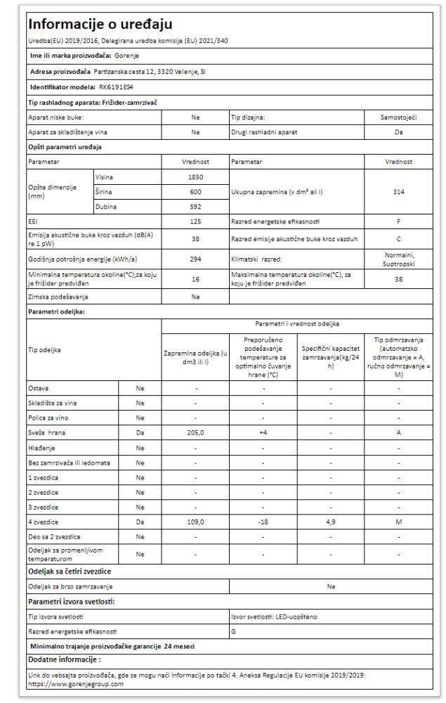 Zapremina frižiderskog prostora: bruto/neto: 210 / 203 l
