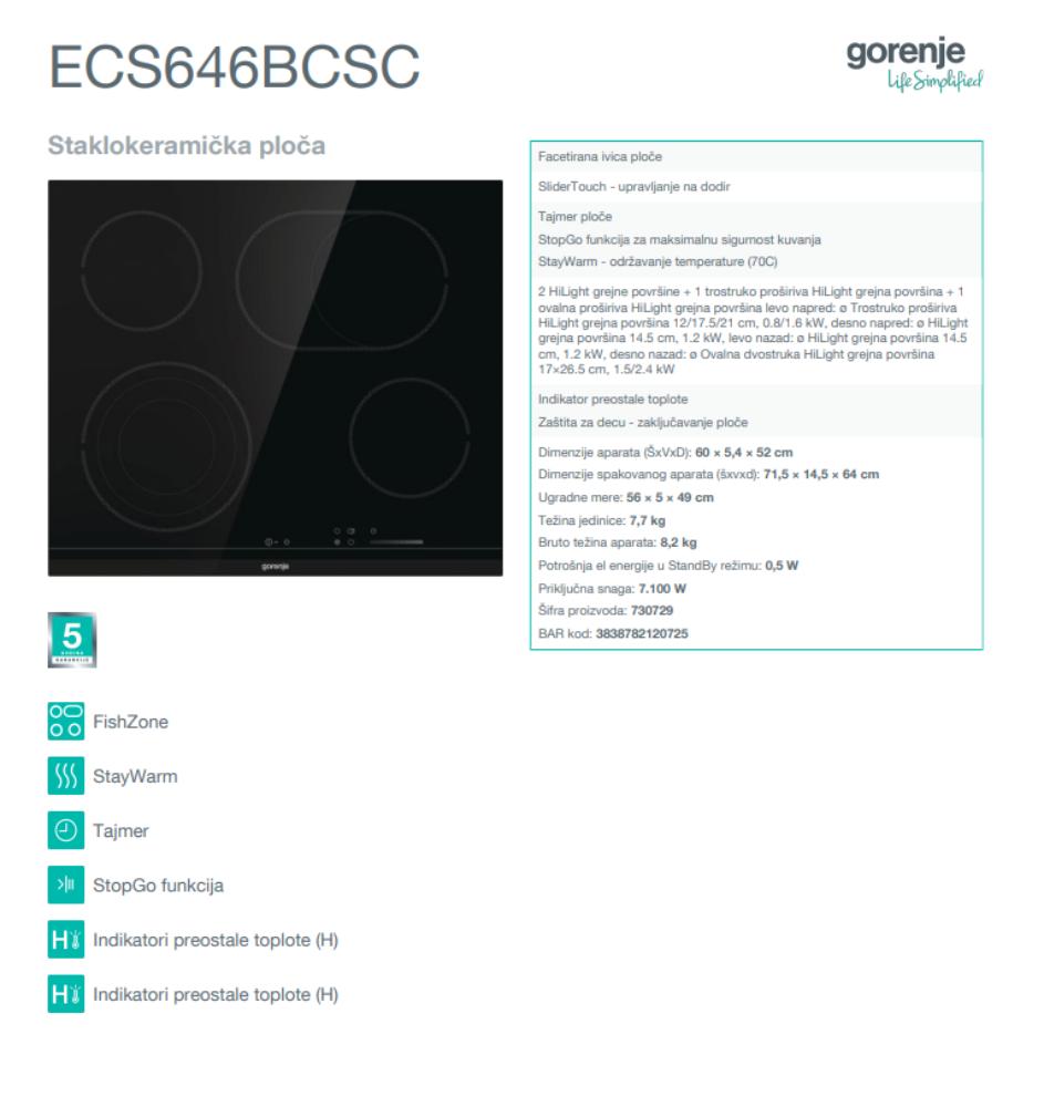 | Funkcije i karakteristike | Indikator preostale toplote Zaštita za decu - zaključavanje ploče Tajmer ploče BoilControl - Automatsko održavanje ključanja StopGo funkcija za maksimalnu sigurnost kuvanja StayWarm - održavanje temperature (70C) |