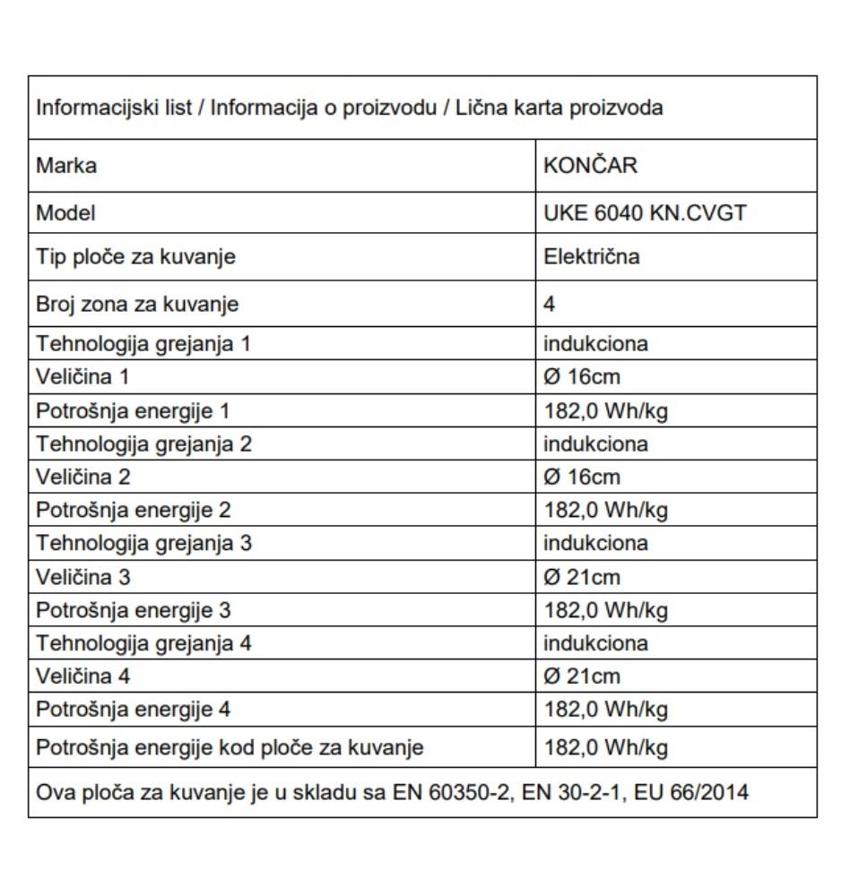 | Ostalo | BOOST Funkcija - pojačavanje snage grejnih zona Displej na kontrolnoj tabli Indikator preostale toplote grejnih zona Elektronske komande na dodir sa zvučnim signalom Zaključavanje kontrolnog panela Sigurnosno isključivanje Zaštita kontrolnog dela od prelivanja Zaštita od pregrevanja |