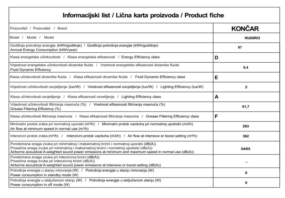 | Funkcije i karakteristike | Mehanički prekidači 2 motora 2 aluminijumska filtera za masnoću Halogena sijalica od 2W 3 nivoa snage |
