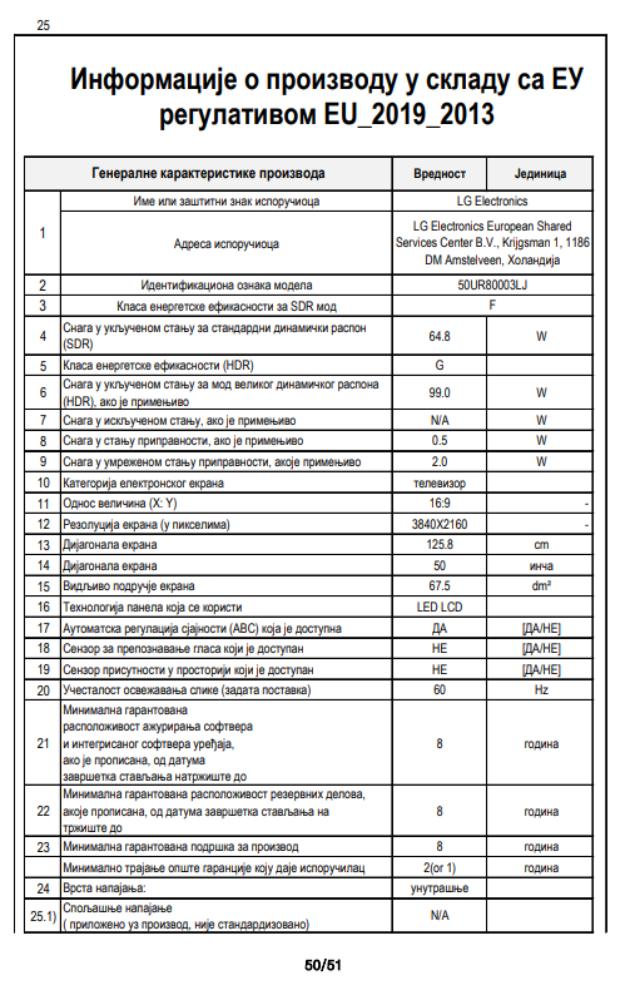 | Dijagonala ekrana | 50" |