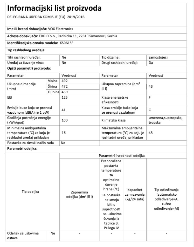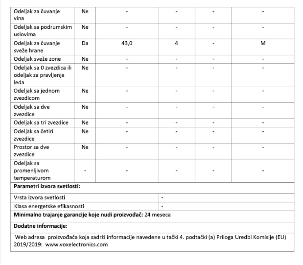 | Neto zapremina frižidera | Neto: 43 l Bruto: 45 l |