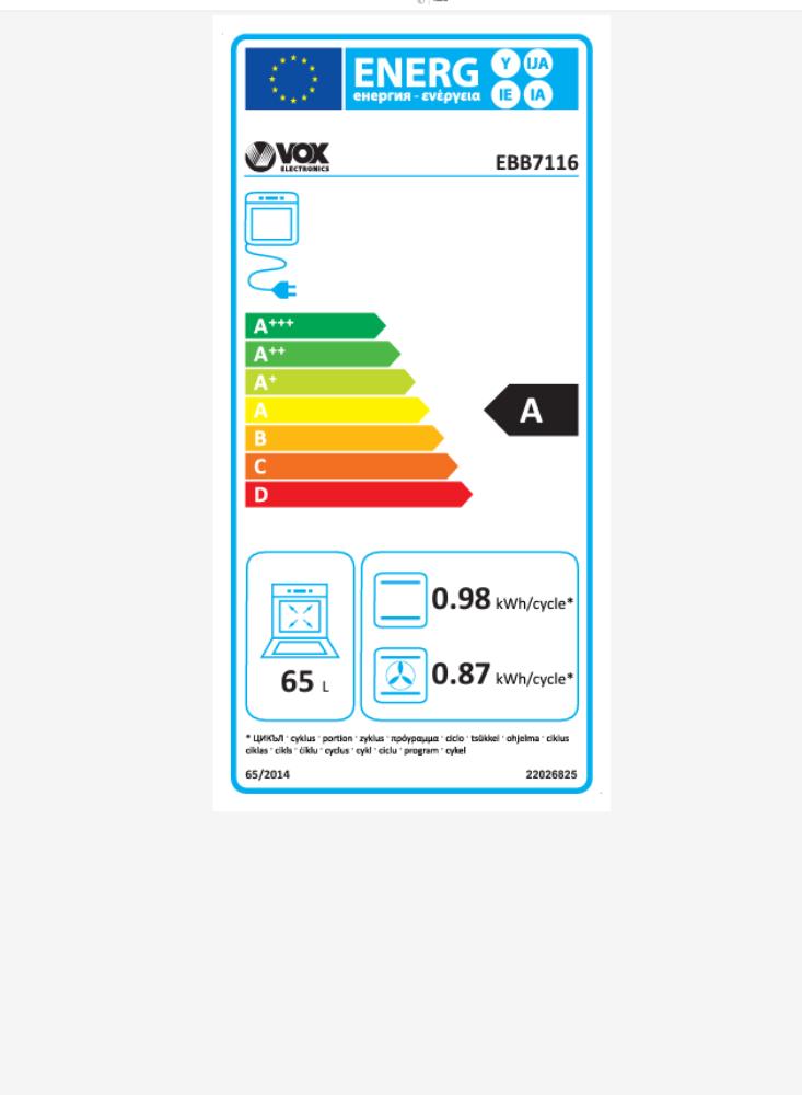 Električna TURBO rerna (grejač oko ventilatora - topao vazduh jednako raspoređen), grill, ventilator, kontrolna tabla: staklo, kontrola na prednjem panelu, strujni kabl.