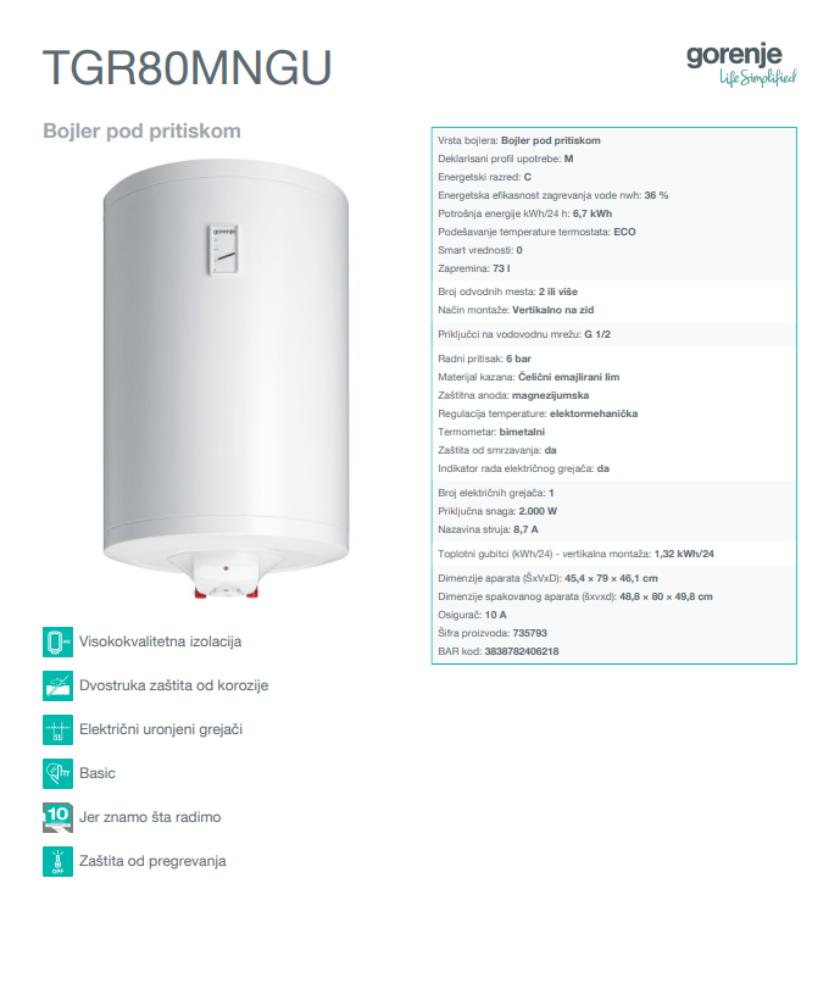 | Ostalo | Zaštitna magnezijumska anoda Odabir željene temperature: Do 65 °C Signalno svetlo - prikaz rada električnog grejača Zaštita od zamrzavanja Termometar Stepen zaštite: IP23 Energetska klasa: C Zapremina za čuvanje vode: 76,1 l Dnevna potrošnja električne energije: 6,7 kWh Godišnja potrošnja električne energije: 1428 kWh Napon: 230 V Nazivna struja: 8,7 A Priključci na vodovodnu mrežu: G1/2 |