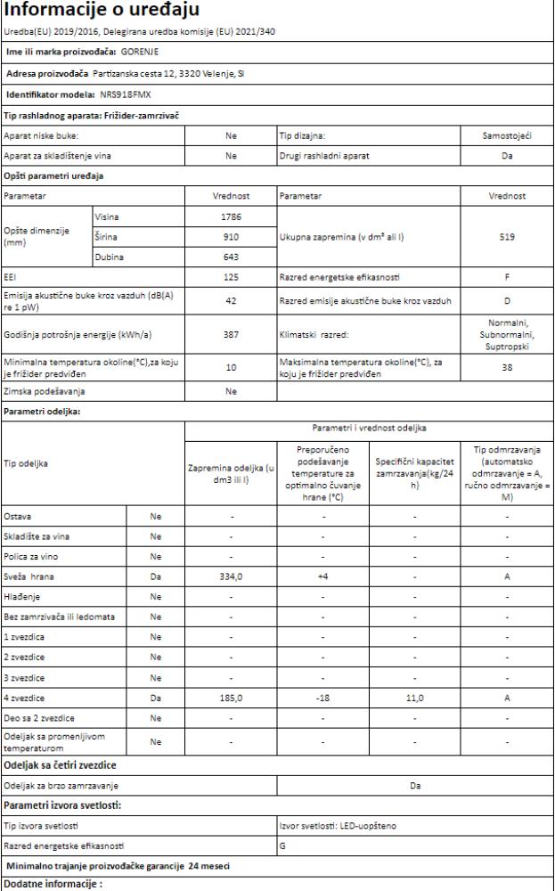 | Funkcije i karakteristike | MultiFlow 360° sistem ventilacije SensoTech elektronsko upravljanje Twist ledomat Inverterski kompresor Vreme čuvanja u slučaju nestanka električne energije 6 h Kapacitet zamrzavanja u toku 24h 11 kg LED osvetljenje na plafonu Zvučni alarm kao indikator za otvorena vrata |