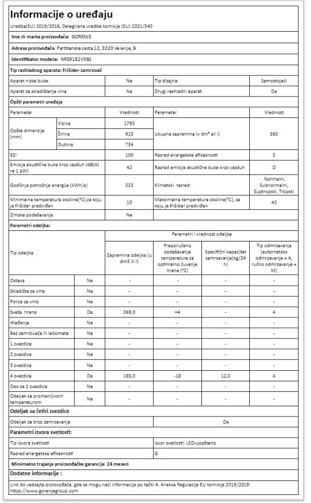 | Zapremina frižidera | Neto: 365 l Bruto: 381 l |