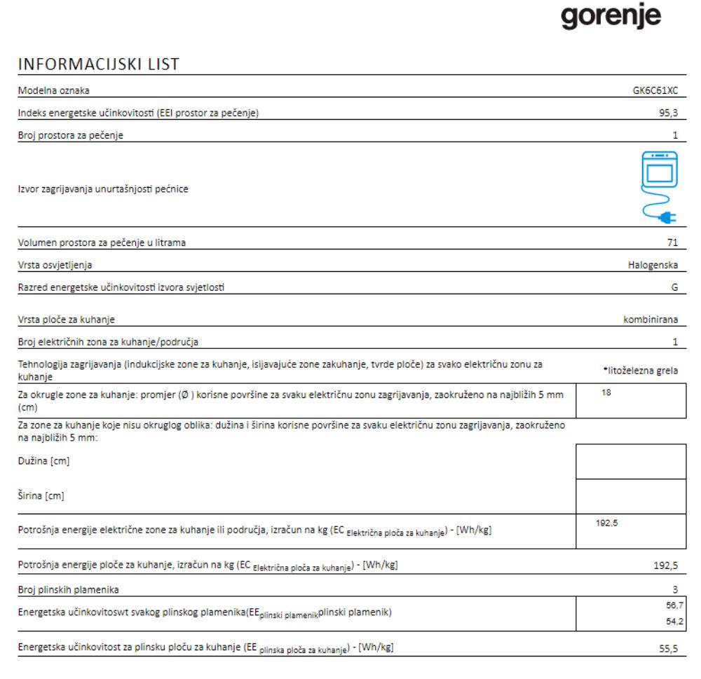 | Polja za kuvanje | Zona za kuhanje sprijeda lijevo Mali plamenik Ø lijevo sprijeda (mm) 54 Snaga zona za kuhanje lijevo sprijeda 1000 W Zona za kuhanje sprijeda desno Veliki plamenik Ø desno sprijeda (mm) 99 Snaga zona za kuhanje desno sprijeda 3000 W Zona za kuhanje straga lijevo Brzogrijuća ploča Ø lijevo straga (mm) 180 Snaga zone za kuhanje lijevo straga 2000 W Zona za kuhanje straga desno Srednji plinski plamenik Ø desno straga (mm) 74 Snaga zone za kuhanje desno straga 1900 W Izvedba nosivih rešetki Lijevano željezo |
