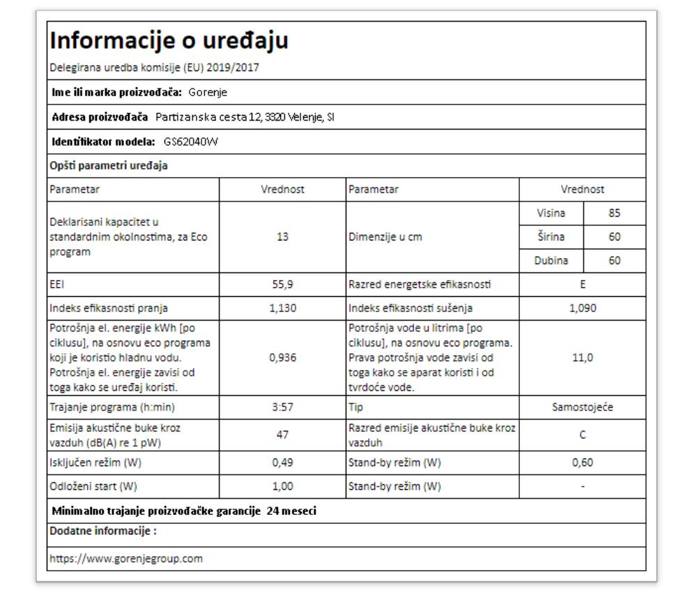 | Potrošnja energije za normalni program kWh |