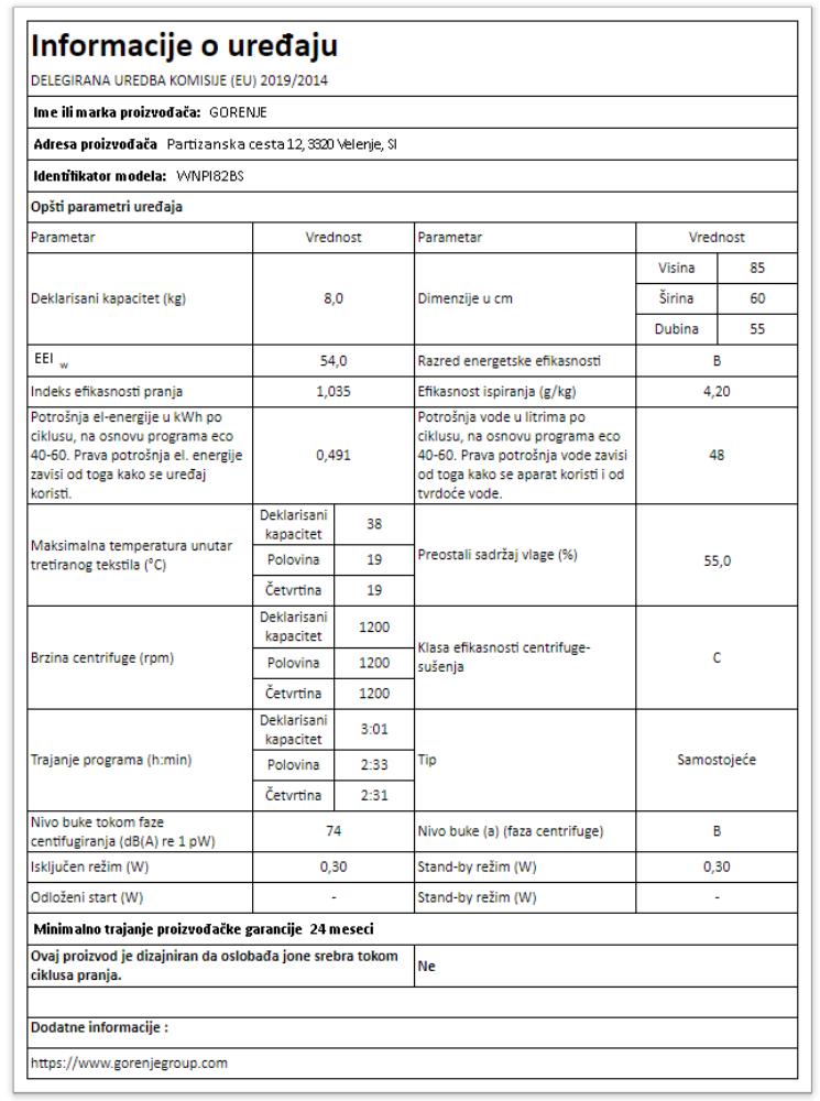 Osnovni programi Pamuk Vuna/ručno pranje Mix sintetika Posebni programi ExtraHygiene Eco 40–60 °C Brzo pranje 20' PowerWash 59' Košulje Dodatni programi pranja SterilTub - antibakterijski program Spin/drain Ispiranje/omekšavanje
