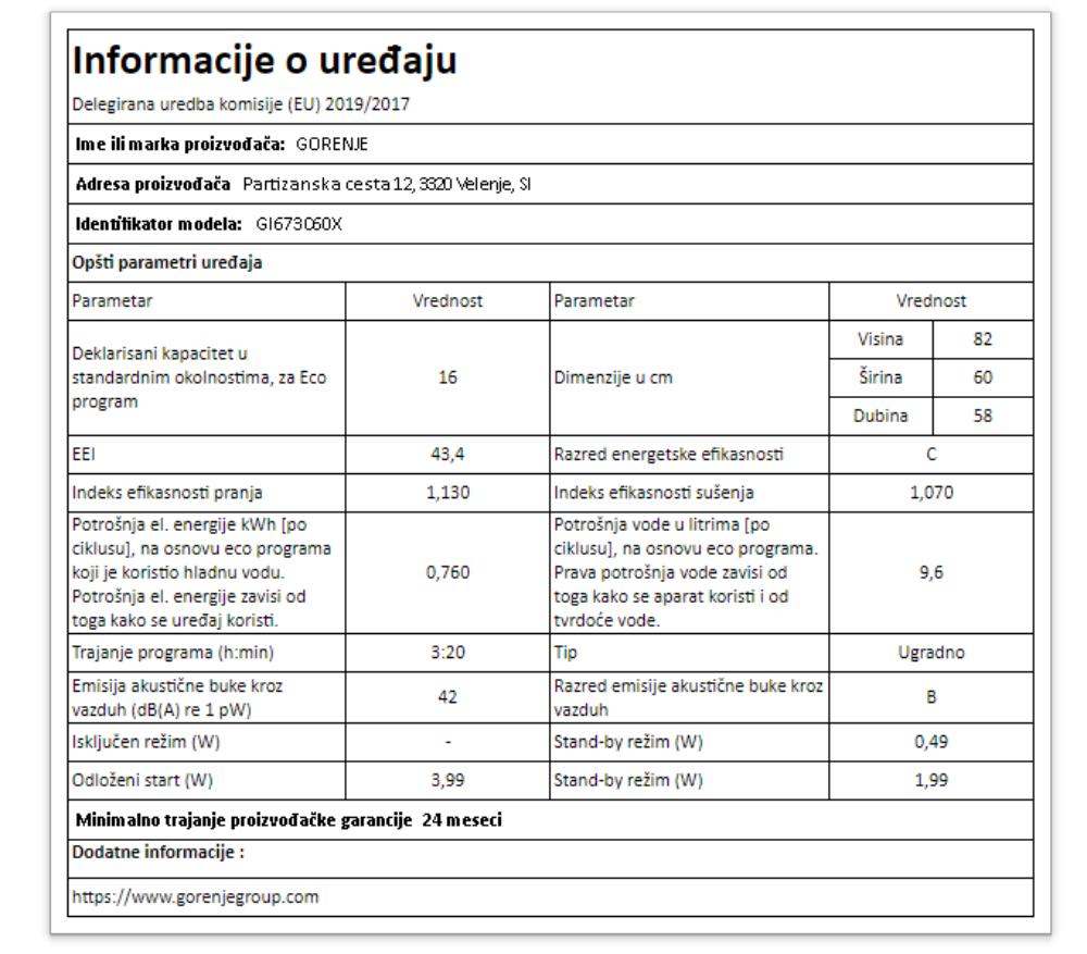 | Dimenzija | Širina proizvoda 598 mm Visina proizvoda 816 mm Dubina proizvoda 575 mm |