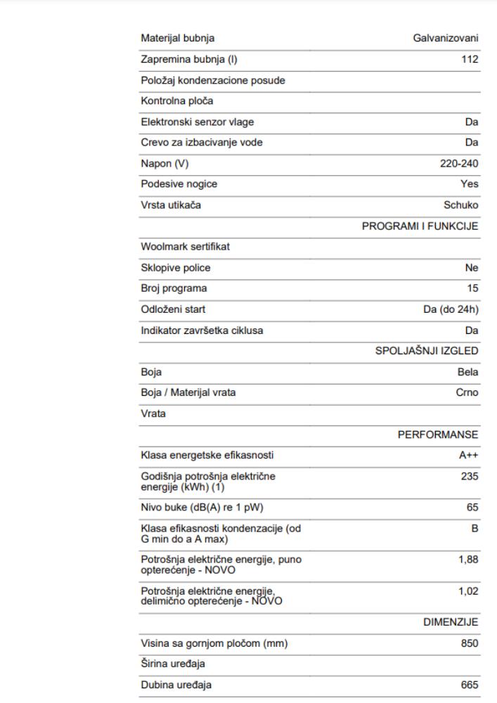 | perfomanse | Klasa energetske efikasnosti A++ Godišnja potrošnja električne energije (kWh) (1) 235 Klasa efikasnosti kondenzacije (od G min do a A max) B Potrošnja električne energije, puno opterećenje - NOVO 1,88 Potrošnja električne energije, delimično opterećenje - NOVO 1,02 |