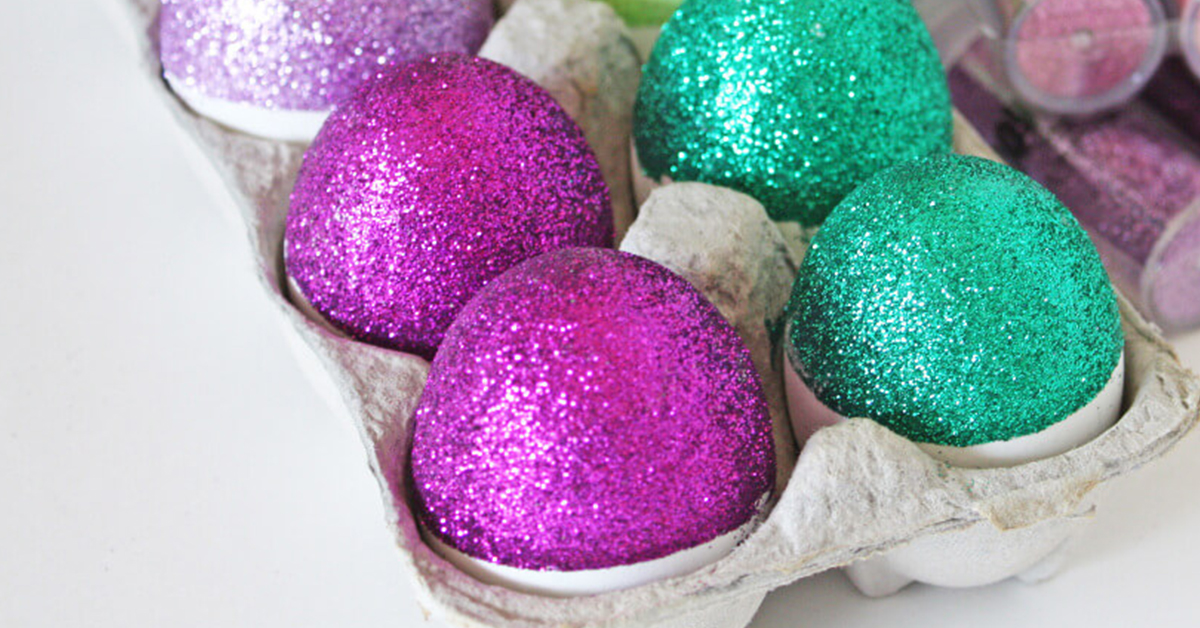 Za ovaj sjajan efekat potrebni su ti sjaj i lepak. Sipaj šljokice u činiju, jaja uvaljaj u lepak zatim u šljokice i pusti ih da se osuše. Oduševiće te krajnji rezultat!
