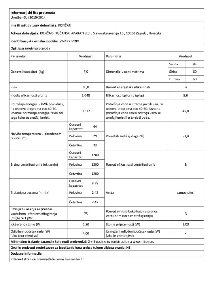 | Funkcije i karakteristike | LED displej, Odloženi start, Pretpranje, Brzo pranje, antialergijski program, odabir brzine centrifuge, prikaz vremena do kraja programa, skraćivanje vremena trajanja programa, zaštita od procurivanja, zaštita od dece |