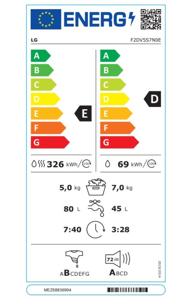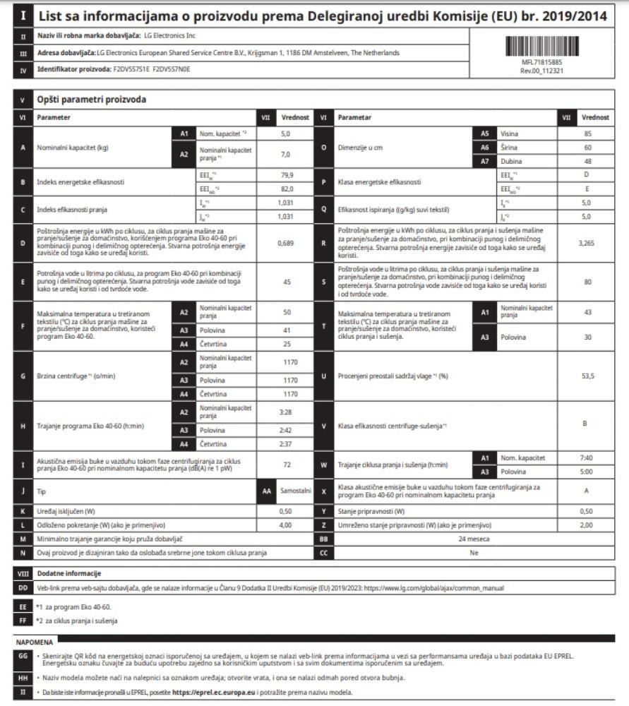 | Programi za pranje | Pamuk Speed14 Preuzmi ciklus - podrazumevano ispiranje + centrifuga Pranje + Suvo Delikatno Ručno / Vuna Samo suvo Očistite bubanj Eko 40°C - 60°C Miks - mešana tkanina Jednostavna nega Uklanjanje alergena - SpaSteam Programi za preuzimanje: Odeća za bebe Odeća za decu Školska uniforma Odeća za plivanje Kišna sezona Farmerke Mrlje od znoja Deodorizacija Uklanjanje Nega boja Ispiranje + centrifuga Brzo pranje + sušenje Suvo za 30 minuta Suvo za 60 minuta Turbo sušenje Košulja suva |